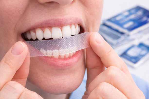 لصقات رقيقة تحتوي على مادة مبيضة توضع مباشرة على الأسنان لفترة محددة يوميًا. من مزاياها: